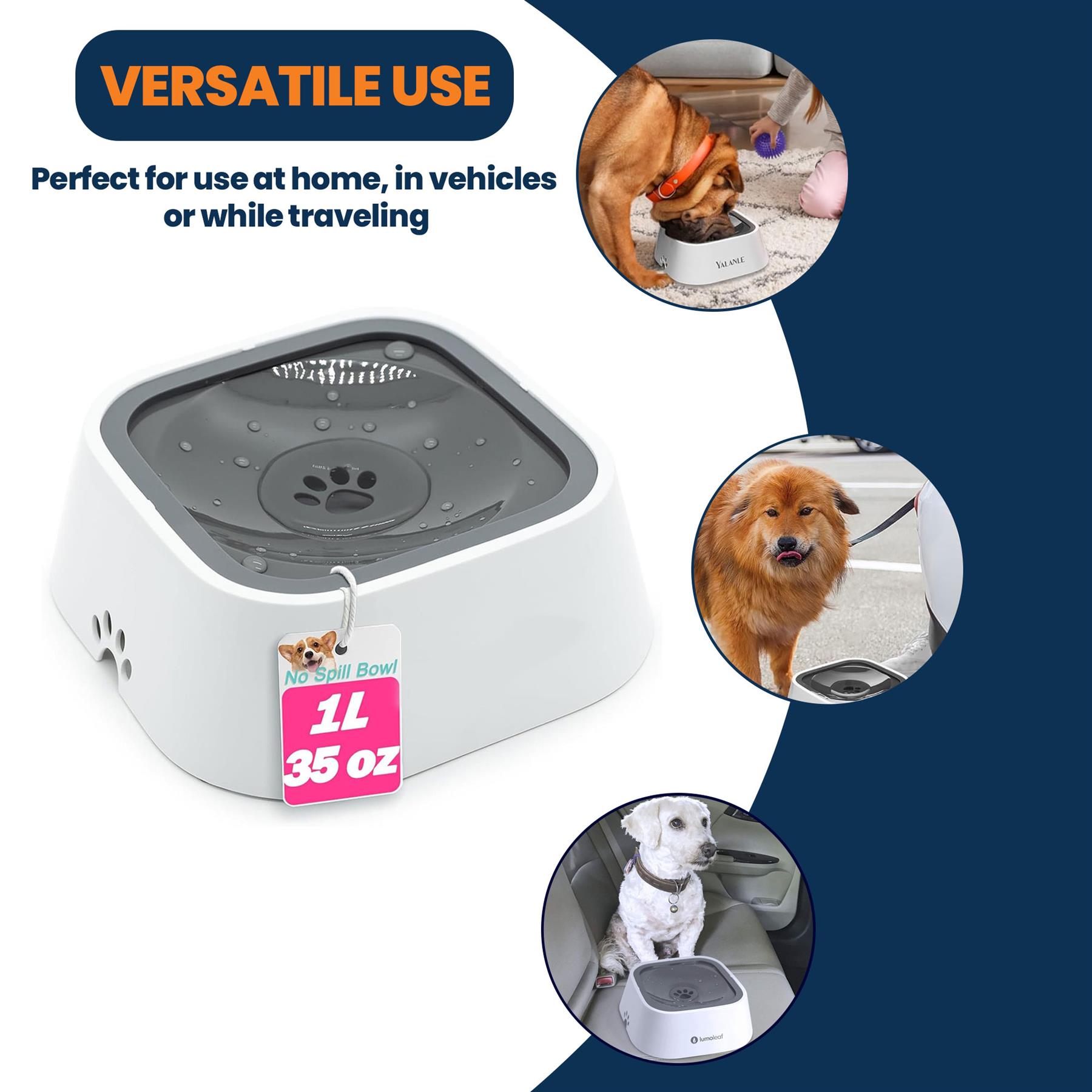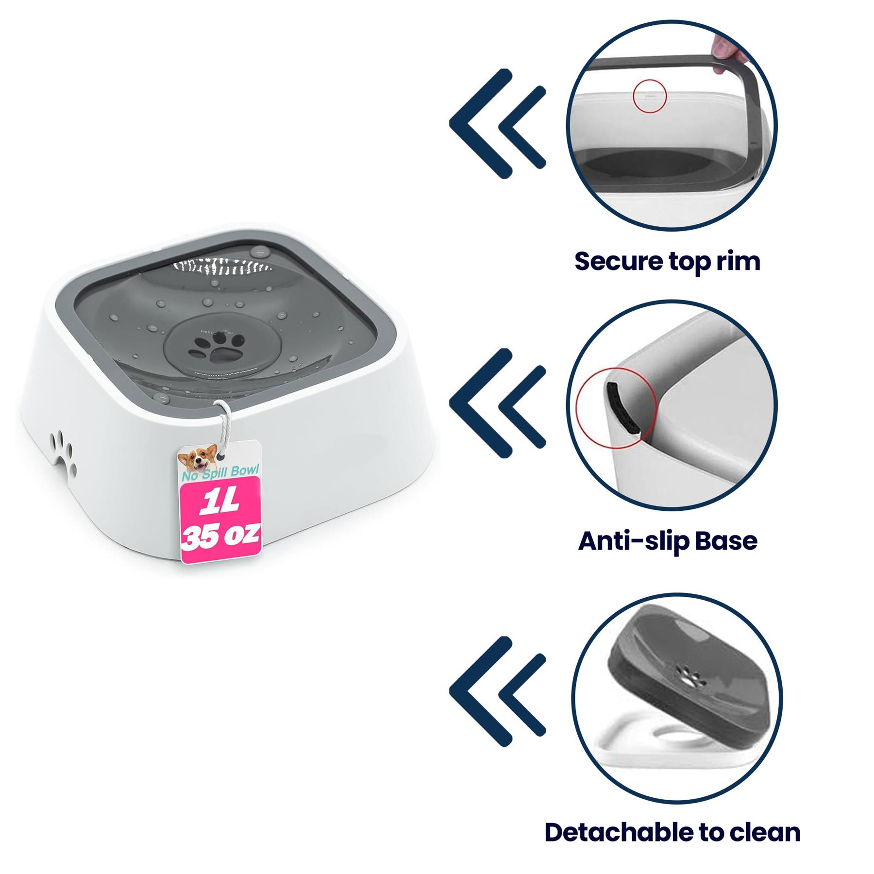 Non-spill slow-drink pet water bowl with 1L capacity. Prevents mess and choking while keeping your pet hydrated. Ideal for home and travel use.
